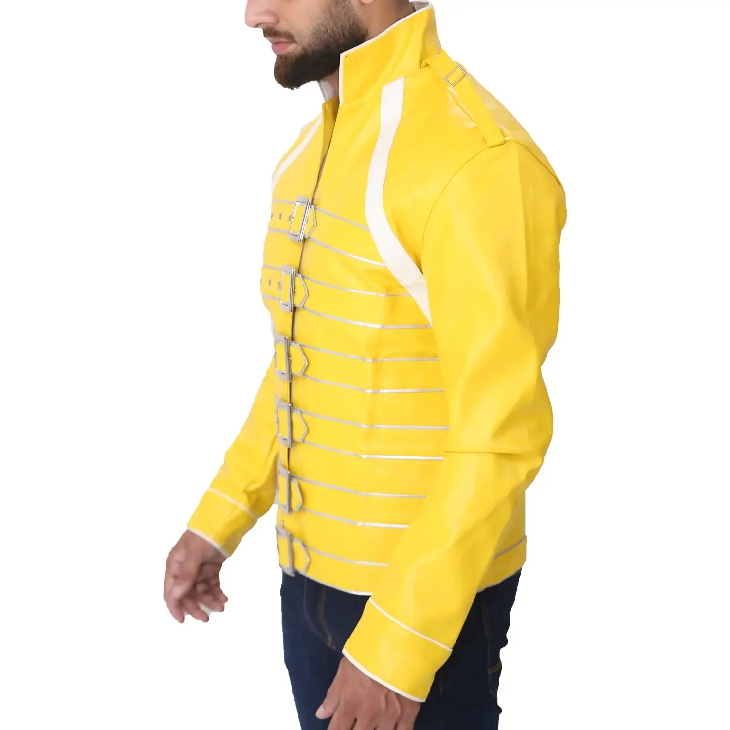 Our Freddie Mercury Yellow Leather Jacket speaks to both the sunny side of Freddie and the ostentatious personality of the rock artist. What is daring and bold about this jacket is its sharp vibrant yellow color which is not for the faint of heart. It looks great when paired with white T-shirts over khaki pants and compliments all skin tones.